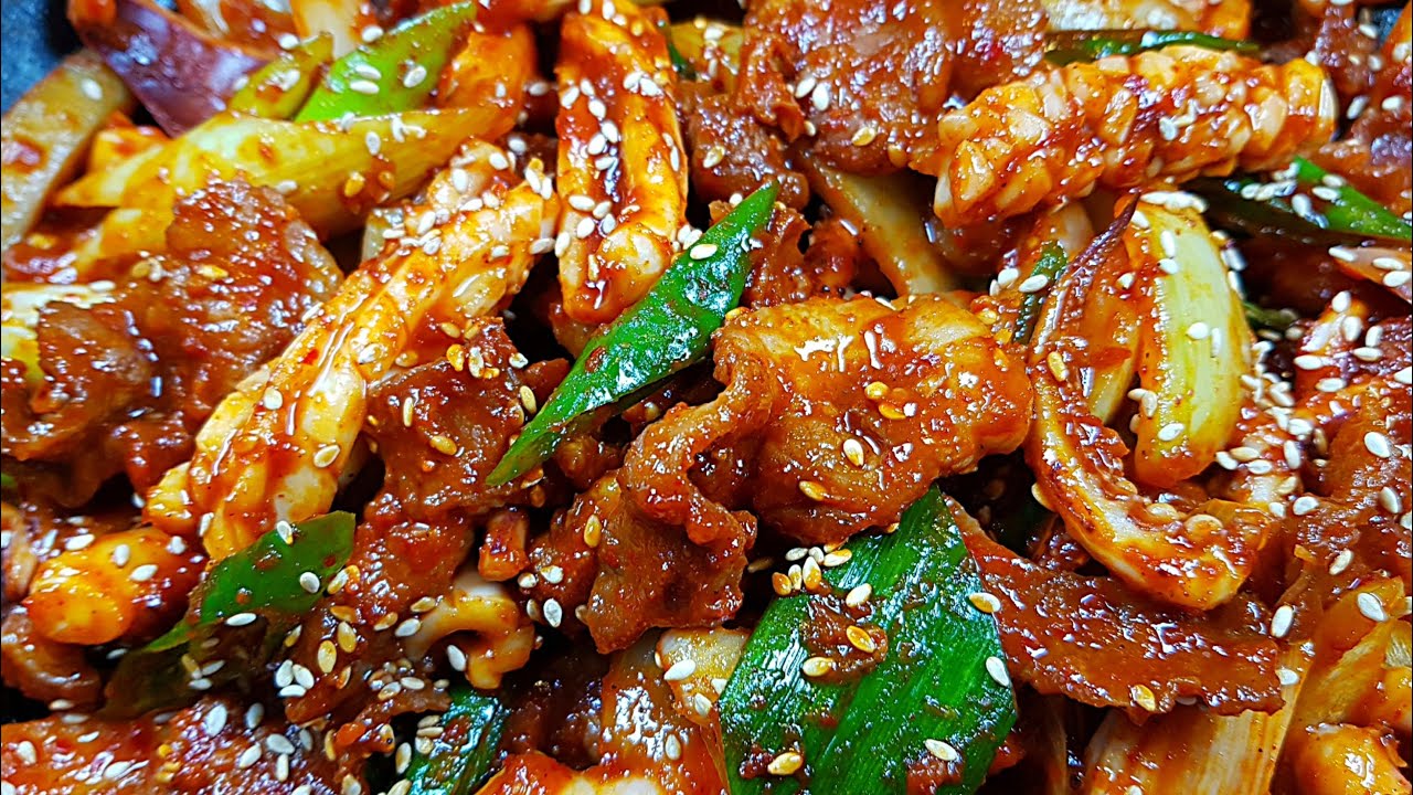 - 고추장만 사용하면 국물이 끈적하고 무거워집니다. 고춧가루와 고추장의 비율을 $2:1$ 정도로 섞어보세요. 여기에 감칠맛을 폭발시키는 비밀 병기인 굴소스를 살짝 추가하면 밖에서 사 먹는 전문점 못지않은 풍미가 살아납니다. 다진 마늘은 아끼지 말고 듬뿍 넣어주어야 고기의 잡내를 완벽히 잡으면서 한국인 입맛에 딱 맞는 매콤한 양념장이 완성됩니다.